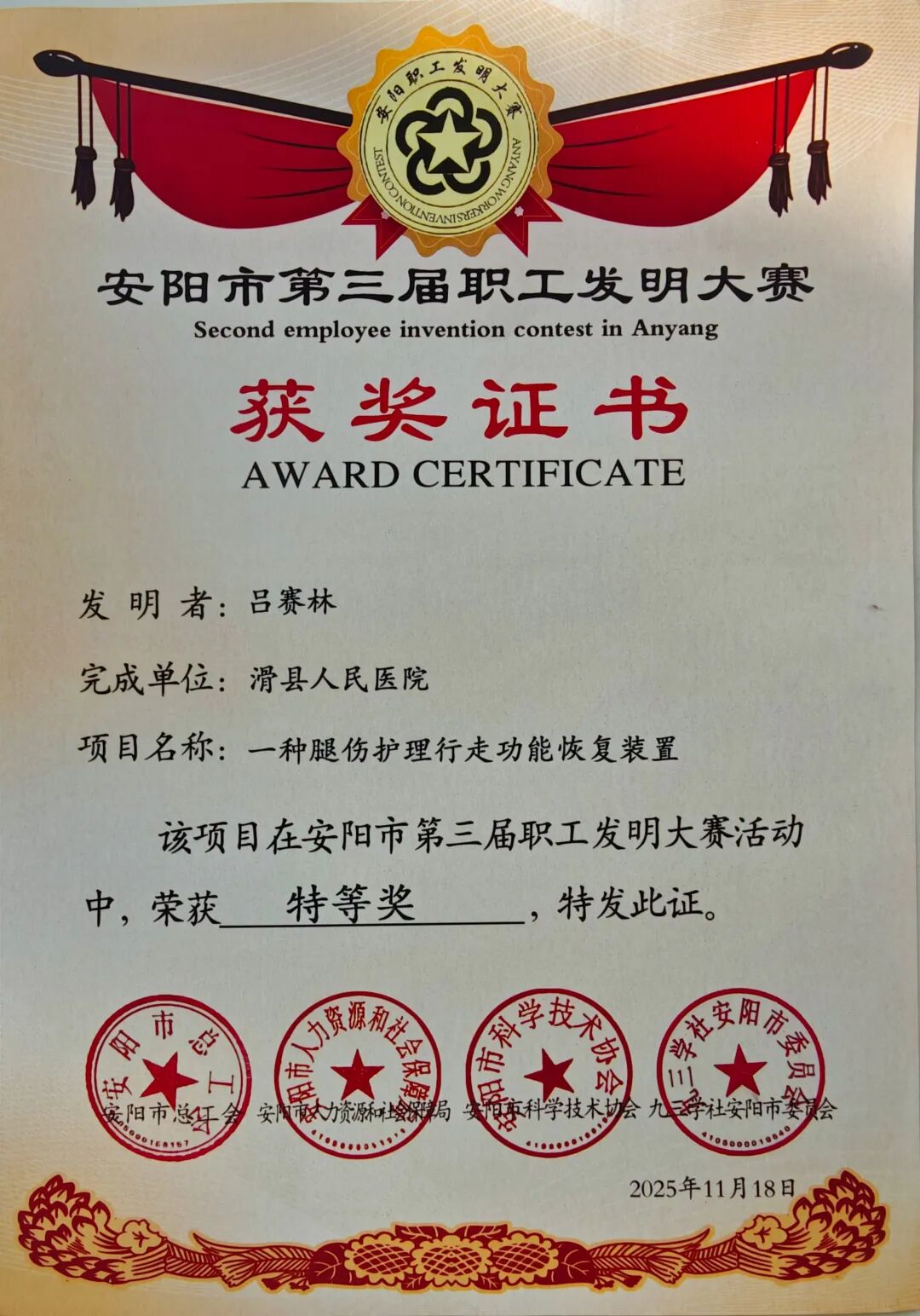 滑县人民医院新生儿重症监护室主管护师吕赛林参赛的“一种腿伤护理行走功能恢复装置”脱颖而出,该项目在大赛中荣获特等奖。王晓民、韩莹、周莺歌、张会会、马静、焦京京也获得不同奖项。