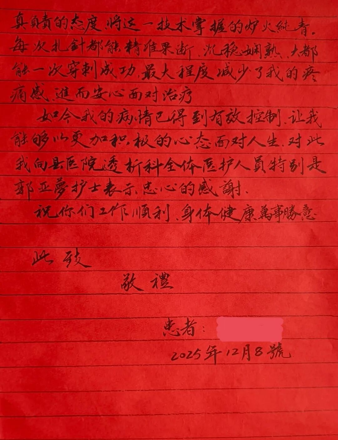 据患者家属讲,这封感谢信辗转托请,先后经滑县电视台老台长执笔、广电局资深总编润色修改。字里行间凝聚着两位媒体人对医护工作的深深敬意,更承载着一个家庭对透析室护理团队专业素养与人文关怀的诚挚谢意。