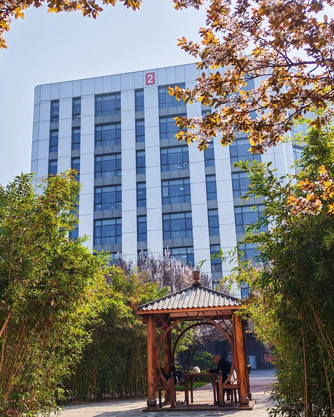 春光正好,暖意融融。楼宇间点缀着缤纷花色,医护人员步履匆匆守护健康,患者与家属在花间休憩,生机与希望在院中静静流淌。