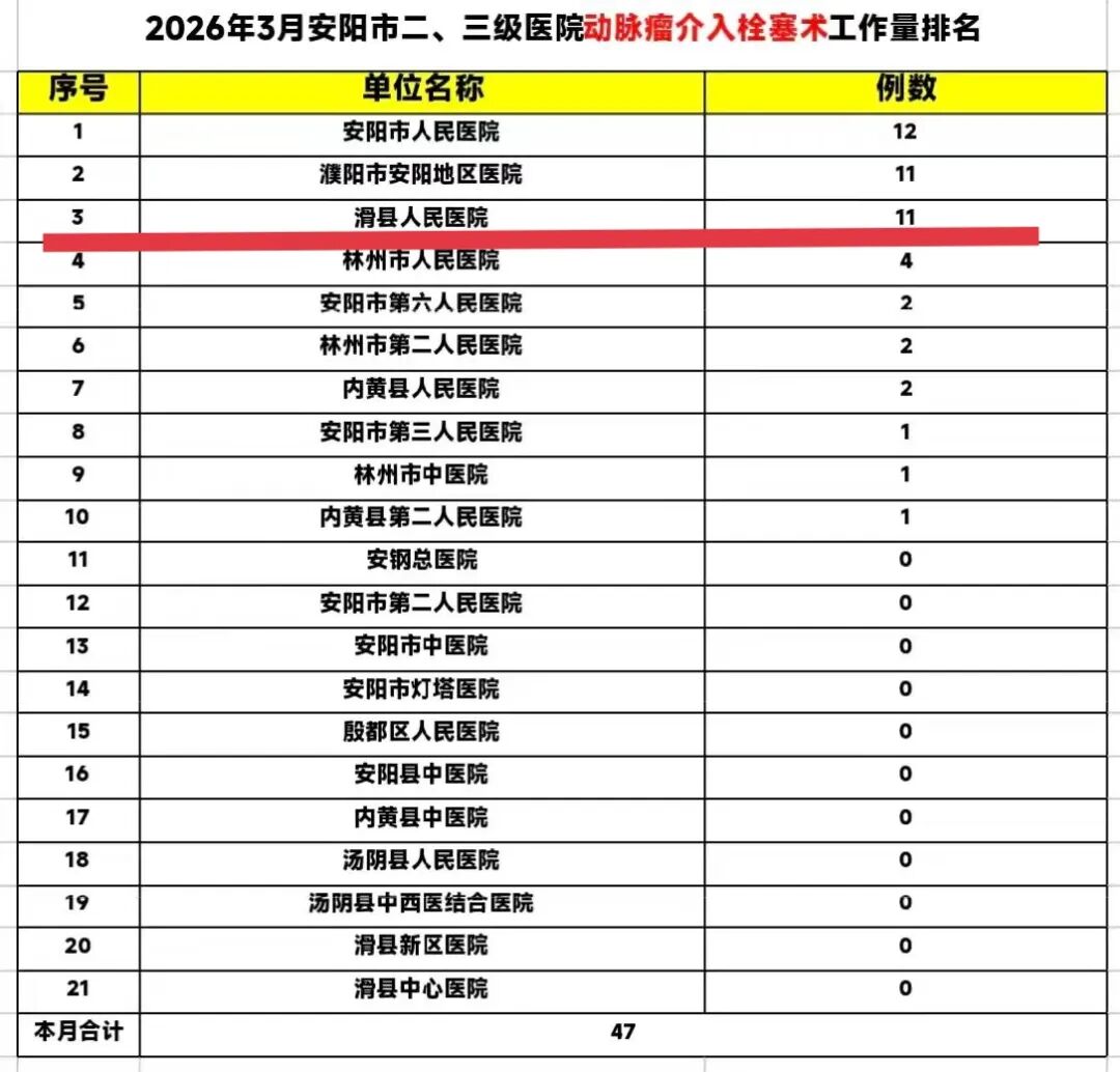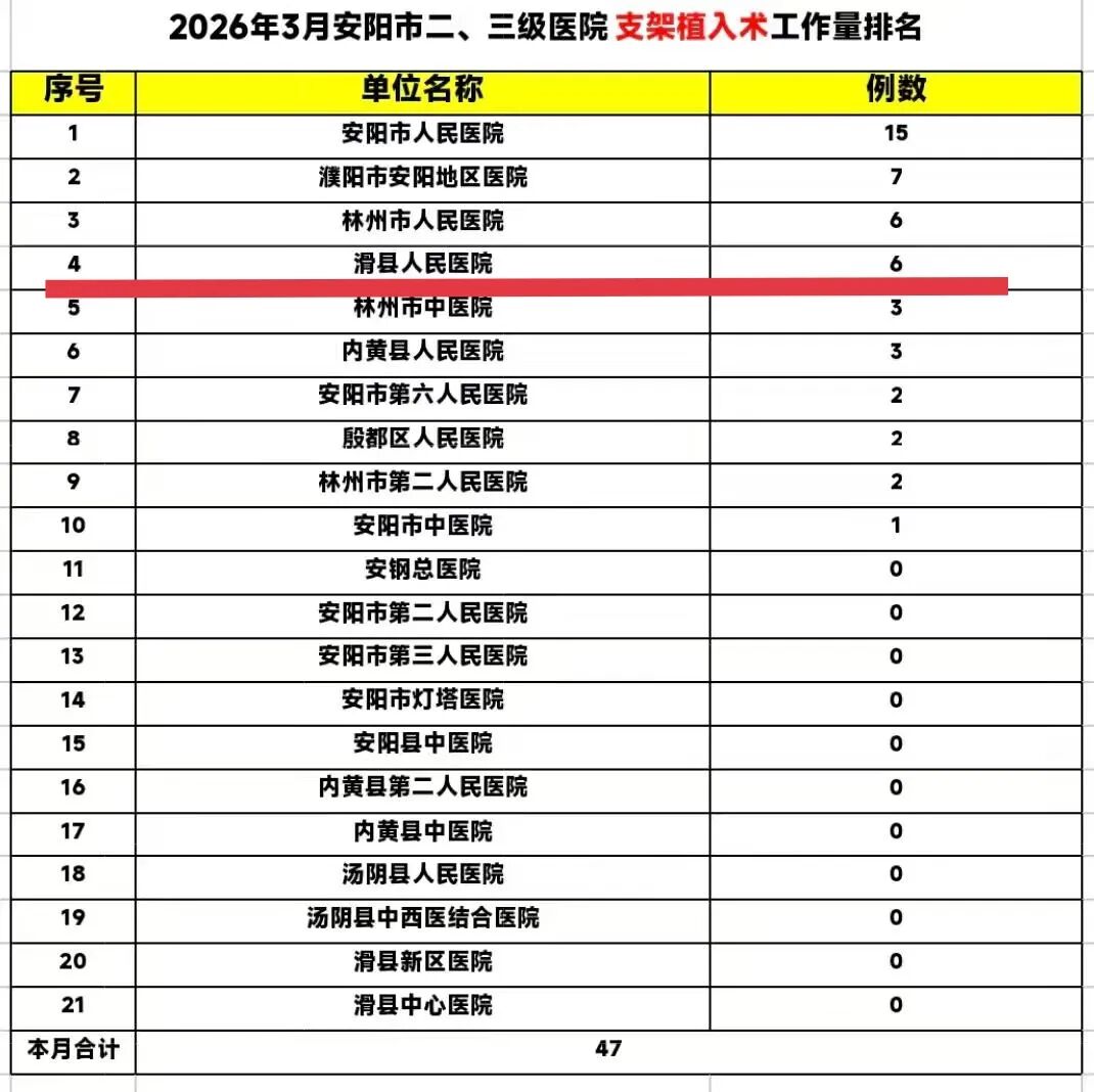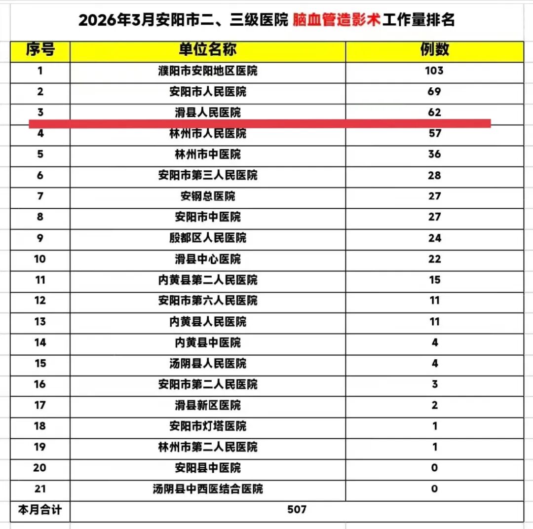 近日,安阳市脑卒中防治办公室依据全市各二、三级医疗机构2026年3月份卒中诊疗工作数据,完成了相关技术工作量的排名工作。