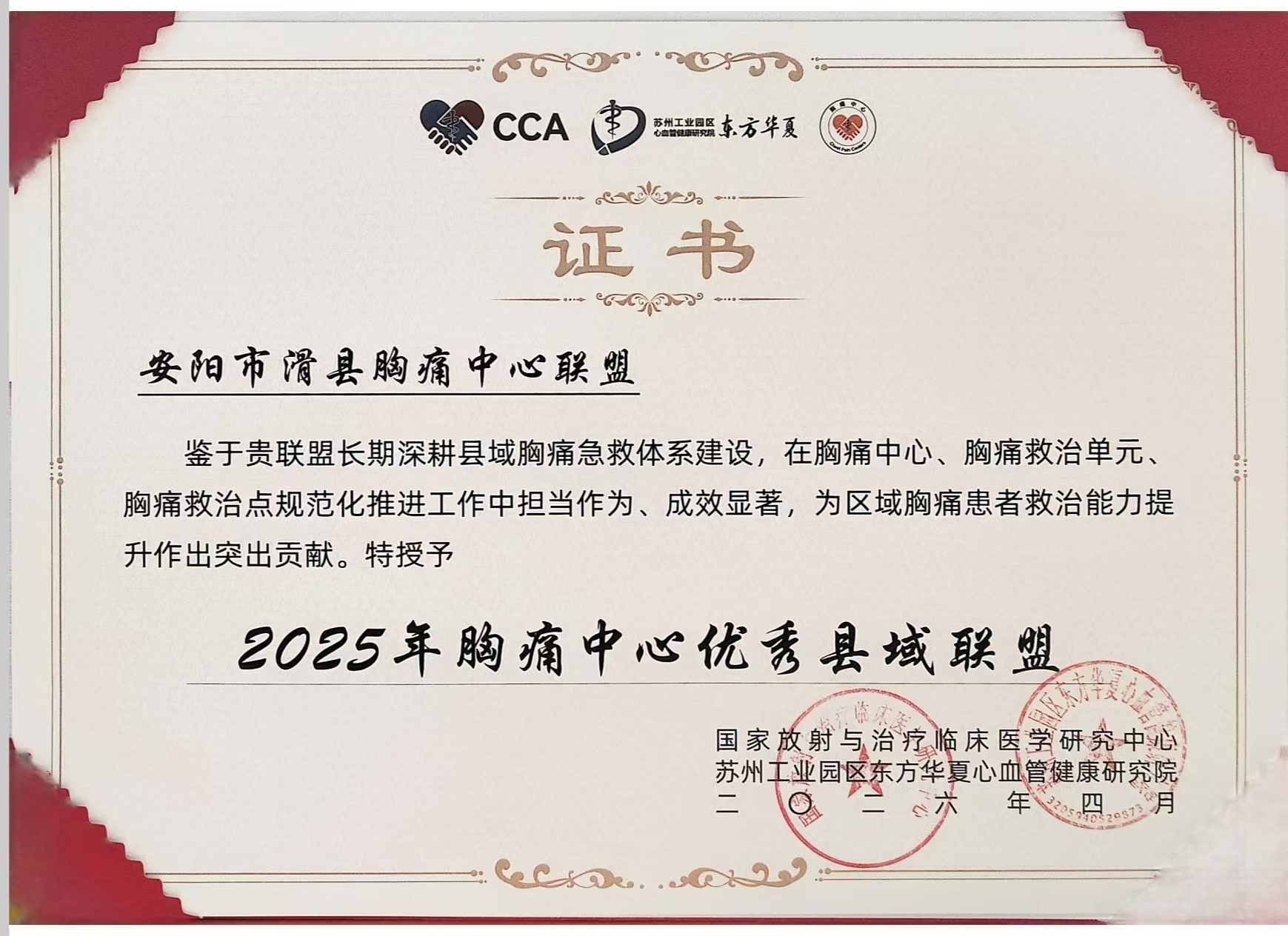 联盟在胸痛中心、胸痛救治单元、胸痛救治点规范化推进工作中担当作为、成效显著,有效打通了急性胸痛患者救治的 “最后一公里”,为区域胸痛患者救治能力提升作出突出贡献,也正是这份扎实的工作成效,让滑县胸痛中心联盟获评 “2025年胸痛中心优秀县域联盟”。