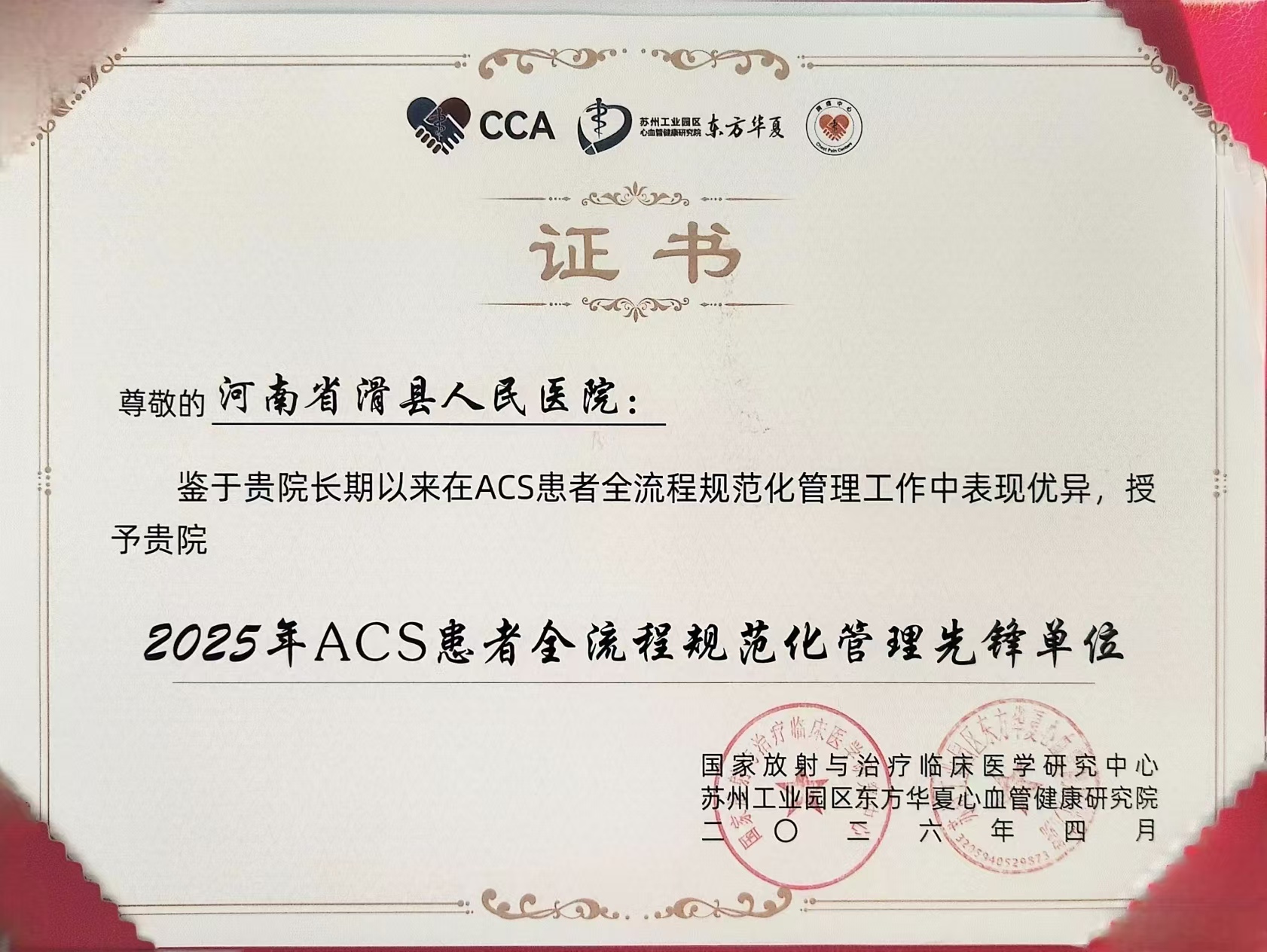 这是国家层面对滑县人民医院胸痛中心建设、急性冠脉综合征(ACS)规范化救治及县域协同救治体系建设的高度认可,标志着滑县胸痛救治水平迈入全国先进行列。